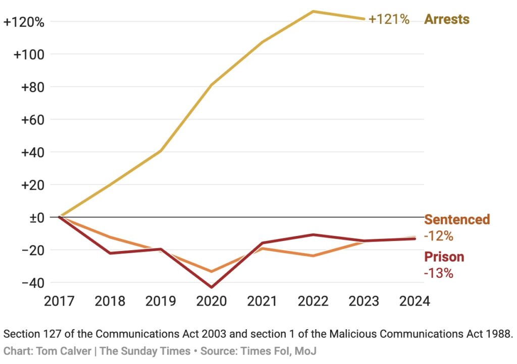 In 2015 the number of people sentenced for posting malicious communications online was 1,983. But by 2024 the figure had fallen to 1,160. Just 137 received immediate custodial sentences, most of which were shorter than two months. In other words, the number of people eventually punished in court for digital free speech infractions has actually fallen by more than 40% in a decade.