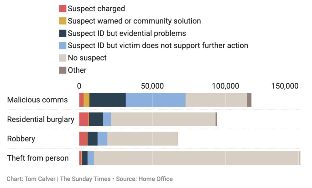Yet the clear-up rate for these online cases is low. The charging rate for all crimes was about 8.8% in 2024; even for home burglaries it is 6.7%. But just 2.5% of malicious communications offences result in someone being charged, even though the police usually know exactly whodunnit.
