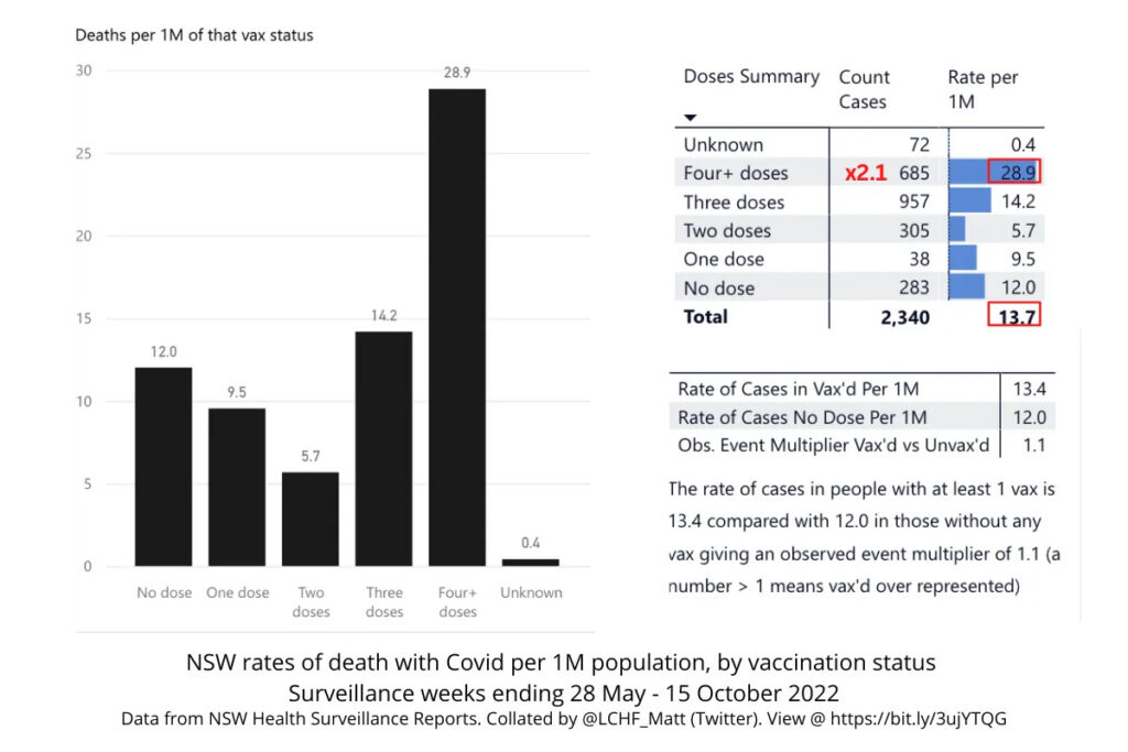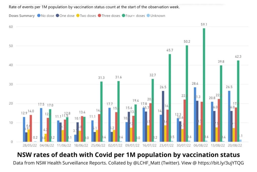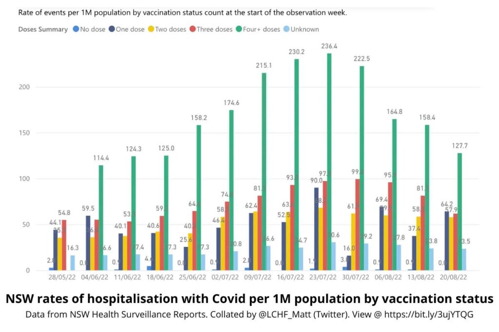 During the pandemic, New South Wales (NSW) Health was the only government department in the country to regularly publish Covid hospitalisation, ICU and death data stratified by vaccination status, and these reports showed a strong association between more shots and worse outcomes, while in many weeks, not a single unvaccinated person was hospitalised with Covid at all.