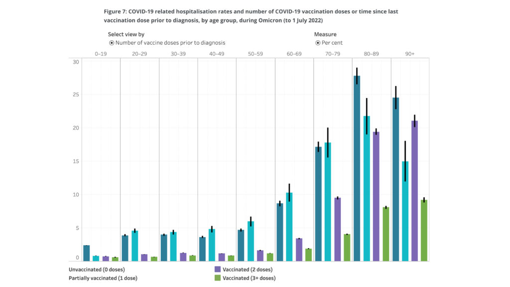 The report, ‘Hospitalisations and deaths following a COVID-19 diagnosis, 2020-2022: a linked data analysis’ by the Australian Institute of Health and Welfare (AIHW) is the first official report to link data on infections, hospitalisation and deaths stratified by age and vaccination status from most states and territories.1