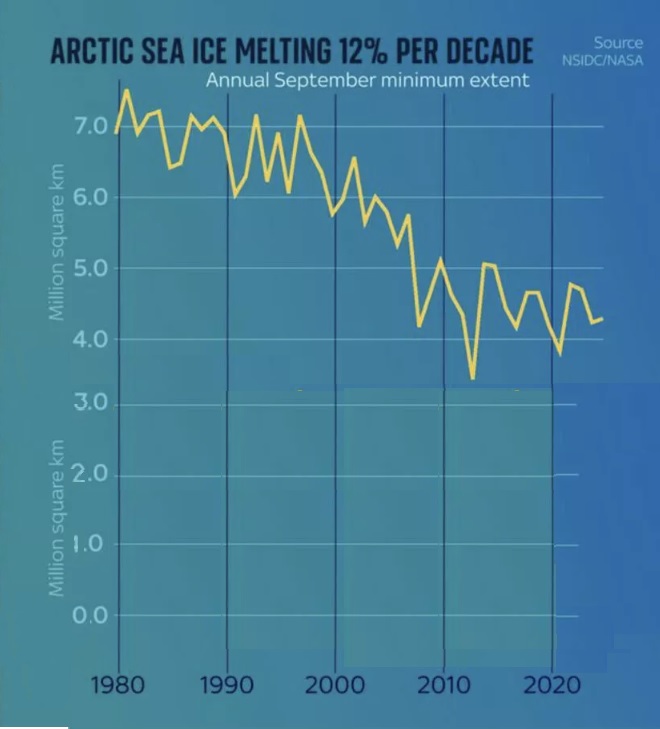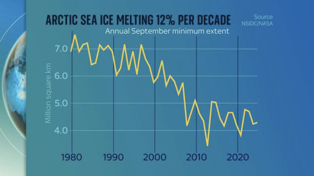 Possibly one of the dumbest and most scientifically illiterate climate scare stories ever written has been published by the fast-fading UK Sky News. Climate reporter Victoria Seabrook notes that the sea ice on the Arctic “continent” is melting at 12% every decade but she backs it up by publishing a graph clearly showing it has been stable since 2007. She goes on to claim that the Arctic melt will push up sea levels around Britain and fuel worse coastal flooding, seemingly unaware that melting ice in liquid does not raise its level (suggested educational tip, check out ice in a gin and tonic glass). Just for good measure, her silly story throws in the wobbling jet stream and a “shocking” prediction that global temperature could rise by nearly 1°C in just five years.