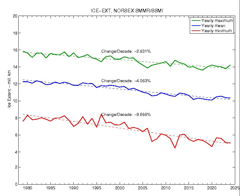 The satellite record is just a small snapshot in history when dealing with natural cycles that occur around the globe. Those who know – ie not climate scientists – talk of a 60-80 year Arctic cycle and so applying a straight line trend to a sinusoidal graph gives a false interpretation. It could be we are at the bottom of a cycle that will soon see an increase in Arctic ice.