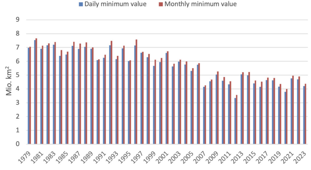 And here is the same but showing Arctic sea ice extent for Summer, with Winter and Autumn, and again edited to show where zero is, and with extended timescale so as to reduce the steep and dramatic gradient. The original begins at 4 million sq km.