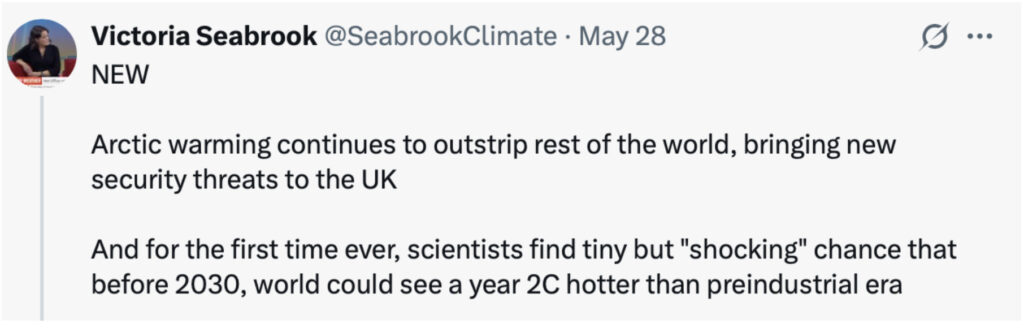 Seabrook picks up on a recent report from the World Meteorological Organisation that is said to forecast a rise in warming from around 1.2°C to 2°C within the next five years. Or, as Seabrook noted in a later X post, “finds” a rise in the warming.