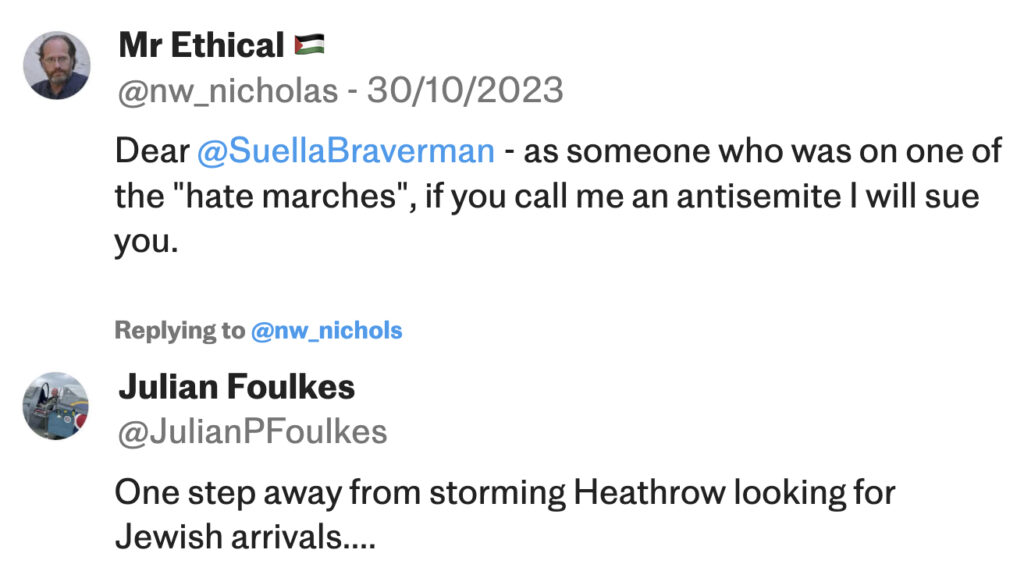 In the post, sent two days before police visited his home, Mr Foulkes wrote: “One step away from storming Heathrow looking for Jewish arrivals…”