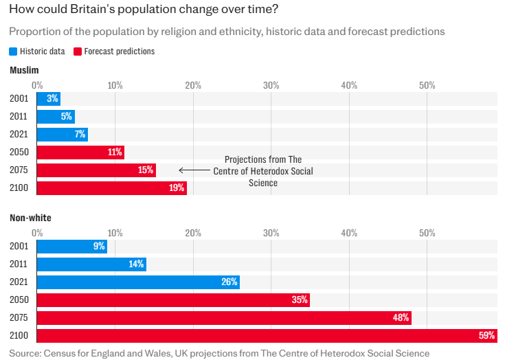 It projects a big rise in the proportion of the UK population comprising foreign-born and second-generation immigrants, from below 20% to 33.5% within the next 25 years.
