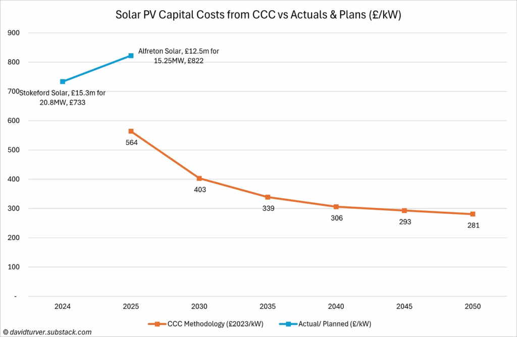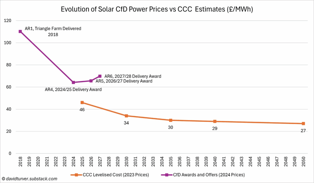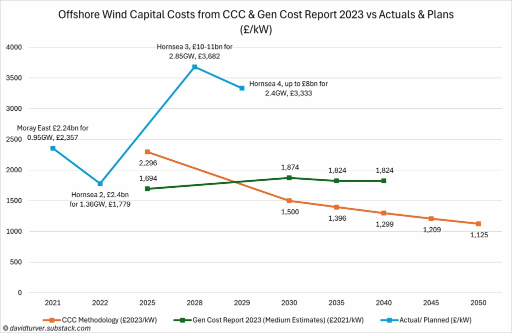 David Turver has an excellent new post out where he shows how much more expensive renewable energy is than the government has projected. It’s worth reading the whole post, but here are some key graphs: