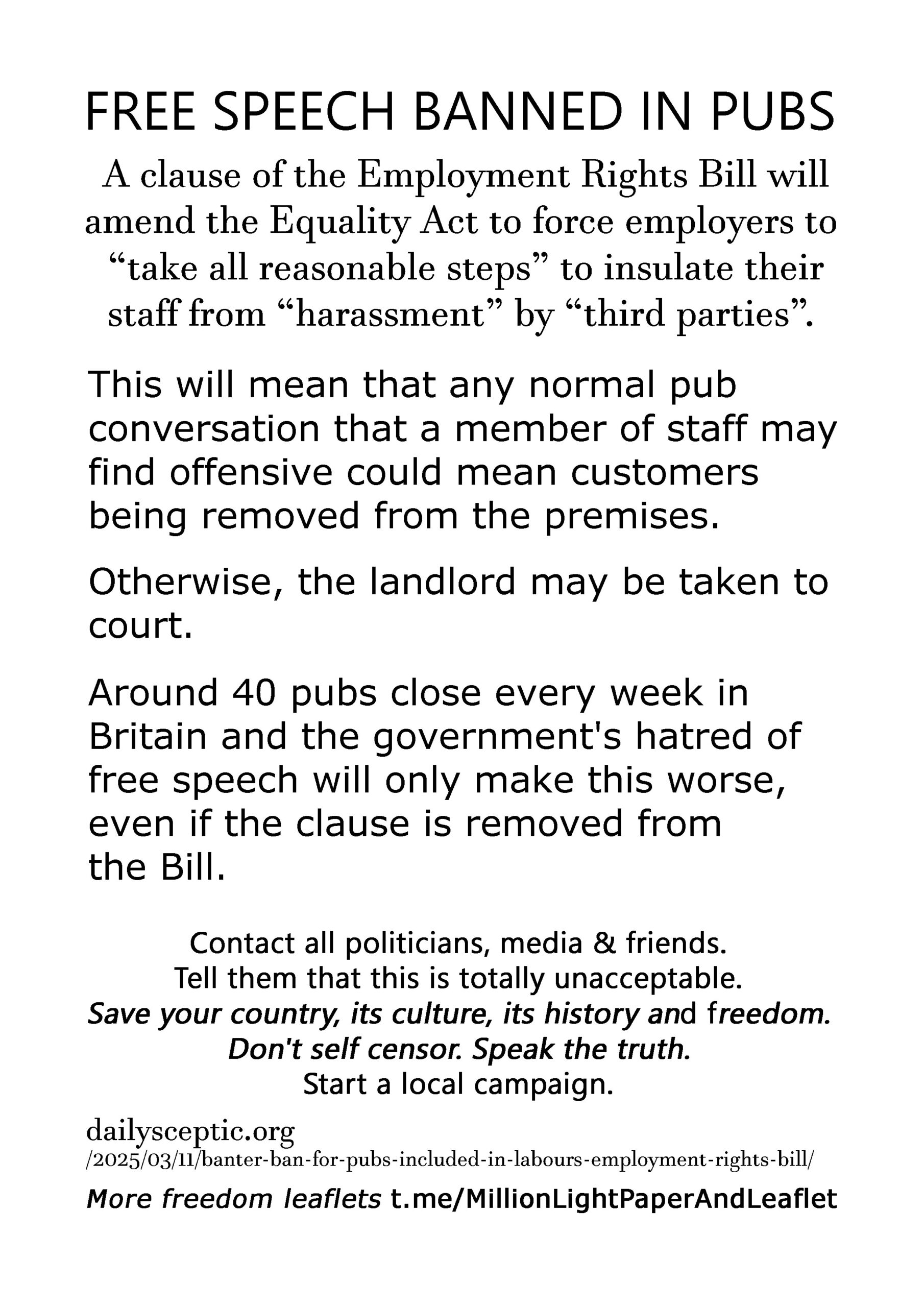 Free Speech Banned in Pubs – latest leaflet to print at home, deliver to neighbours, forward to your bad MP & friends online. Start a local campaign. Deliver 100 leaflets a week (5200 a year). Over 300 leaflet ideas on the link on the leaflet.