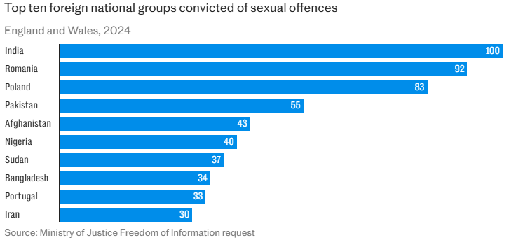 Data from the Ministry of Justice (MoJ), obtained under freedom of information laws, showed that 26% of the 1,453 sex assault convictions women last year were accounted for by foreign nationals.