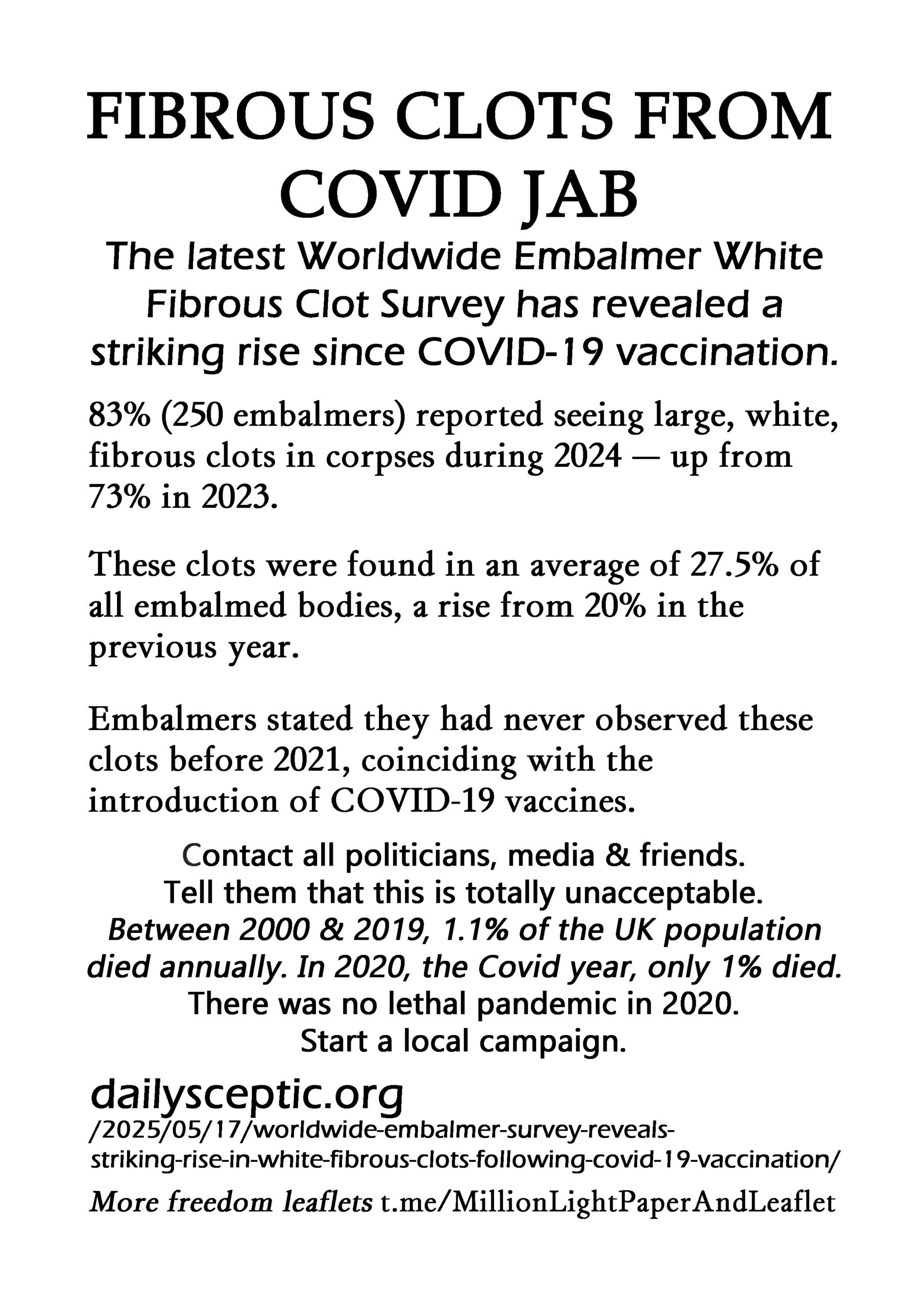 03b Fibrous Clots From Covid Jab – latest leaflet to print at home, deliver to neighbours, forward to your bad MP & friends online. Start a local leaflet campaign. Deliver 100 leaflets a week (5200 a year). Over 300 leaflet ideas on the link on the leaflet.