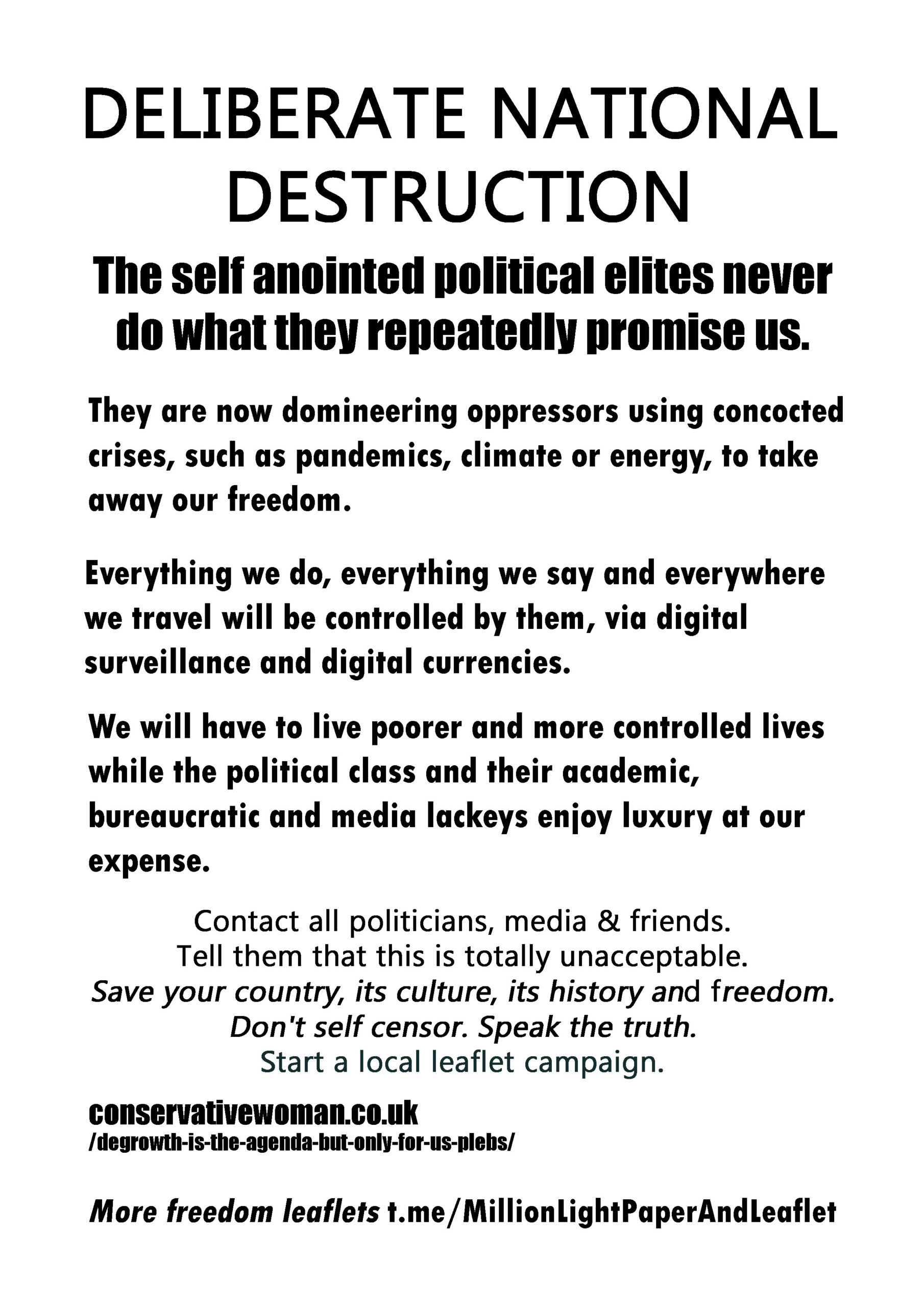 Deliberate National Destruction – latest leaflet to print at home, deliver to neighbours, forward to your bad MP & friends online. Start a local leaflet campaign. Deliver 100 leaflets a week (5200 a year). Over 300 leaflet ideas on the link on the leaflet.