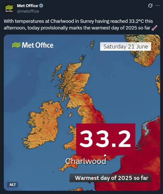 Regarding the weather conditions at Gatwick on the 21st June 2025 and the ‘record-breaking’ heat measured at Charlwood in Surrey.
