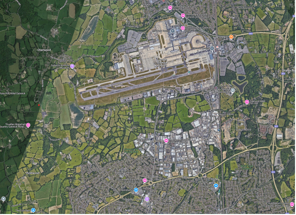 The problem with that is, as all who track these stories know well, these seemingly record-breaking thermometer readings come from weather stations sited at airports. Charlwood is no exception, being sat about a kilometre from Gatwick Airport’s runway. The Charlwood weather station is depicted below by a small red dot.