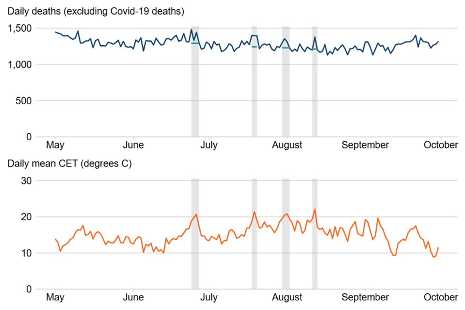 According to the HSA’s ‘Heat mortality monitoring report, England: 2024‘, last year four main heatwave events claimed the lives of 428 people aged 75 to 84, and 753 people aged 85 or over. That may sound like a lot, but here’s what it looks like, when seen in the context of total numbers of daily deaths.