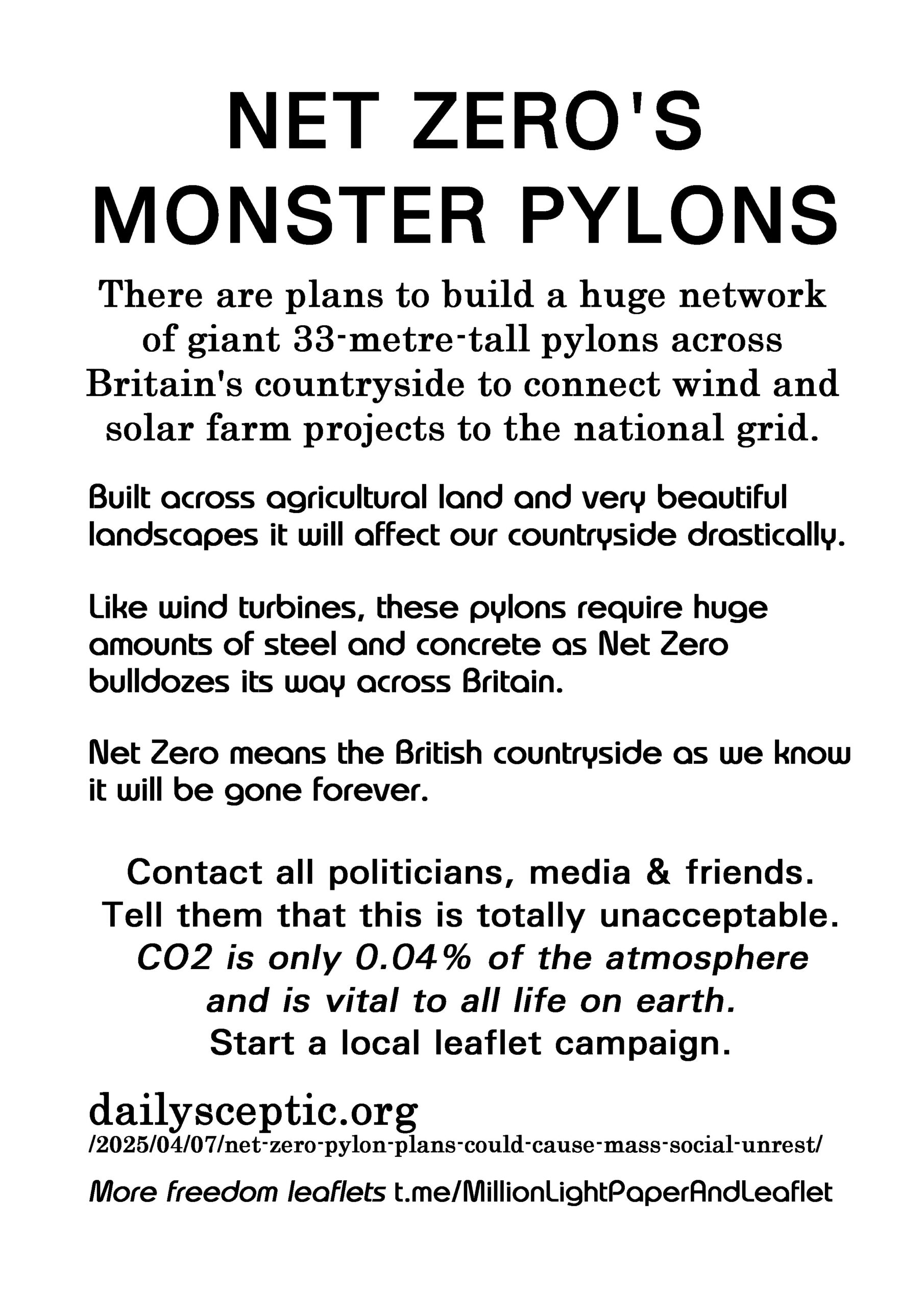 Net Zero’s Monster Pylons – latest leaflet to print at home, deliver to neighbours, forward to your bad MP & friends online. Start a local leaflet campaign. Deliver 100 leaflets a week (5200 a year). Over 300 leaflet ideas on the link on the leaflet.