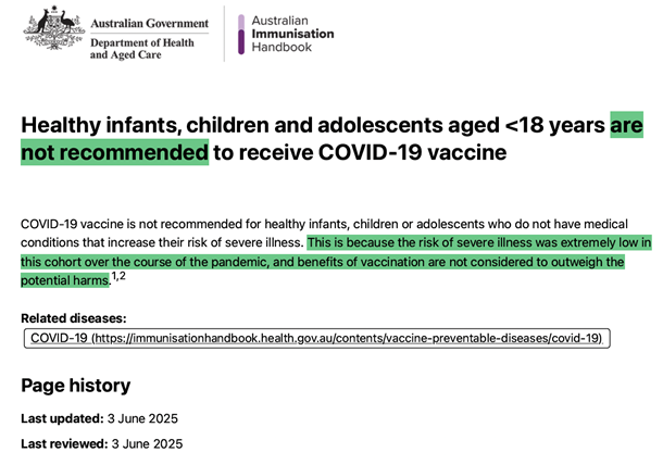 Trust the government health experts as your single source of truth on anything and everything to do with Covid, including vaccines. They always prioritise your health over Pharma profits. And they are always right, even when they do a 180 degree about turn. Australia’s Department of Health advice on June 3rd 2025: