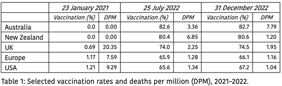 Figure 2 and Table 1 show that the deaths per million in July 2022 for New Zealand and in January-February 2023 for Australia were among the highest in the world. Yet, for both, the deaths were flat in the pre-vaccination period. By contrast, peaks for the other three I have used for reference in this chart (UK, US, Europe) were at their highest before vaccination took hold. This is why I remain surprised that Australia and New Zealand data have not figured far more prominently in the commentary by those sceptical of the narrative.