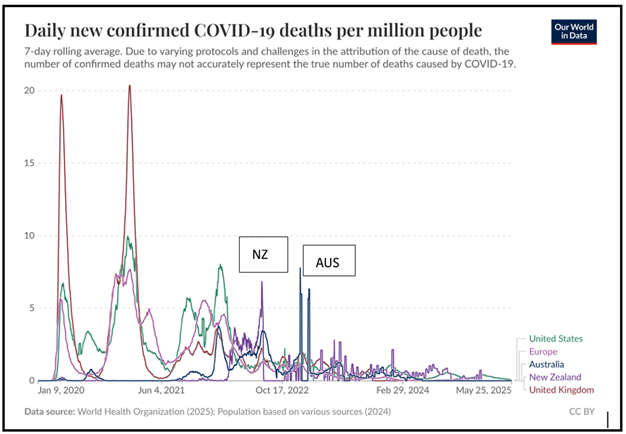 According to Our World in Data, New Zealand achieved 75% coverage of the initial COVID-19 vaccination protocol (two doses) on December 29th 2021, when its Covid-related death toll was just 44, and 80% (tantamount in effect to universal adult coverage) on June 8th 2022, by which time deaths had risen to 2,095. As at May 13th 2025, its death toll stood at 4,538. In other words, more than half of all New Zealand’s Covid deaths occurred after effectively universal adult vaccination had been achieved and a scarcely believable 99% after 75% of the country’s population had been double vaccinated.