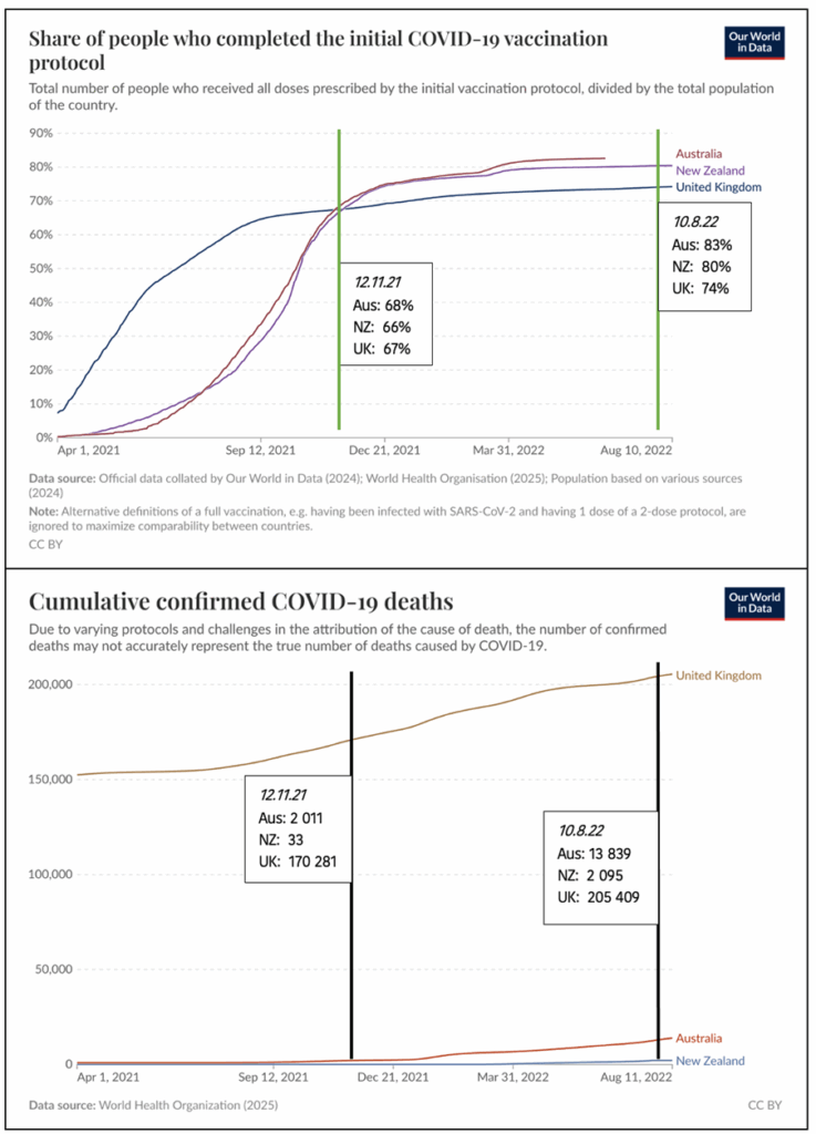Thus a significantly higher proportion of the British population had immunity acquired through infection than their Australasian counterparts by the end of 2021. When, believing in the protective benefits of the vaccine, Australia and New Zealand opened up again, their Covid-naïve populations were vulnerable to the virus. By August 2022 the cumulative case totals were comparable in all three countries: slightly over one-third (35-37%) of the population. And by now there is a wealth of literature indicating that natural immunity is both more robust and longer-lasting than the weaker and shorter protective efficacy of Covid vaccines (which also rather changes the harms-benefit equation for healthy people under 70). Australia and New Zealand stand as stark demonstrations of this.