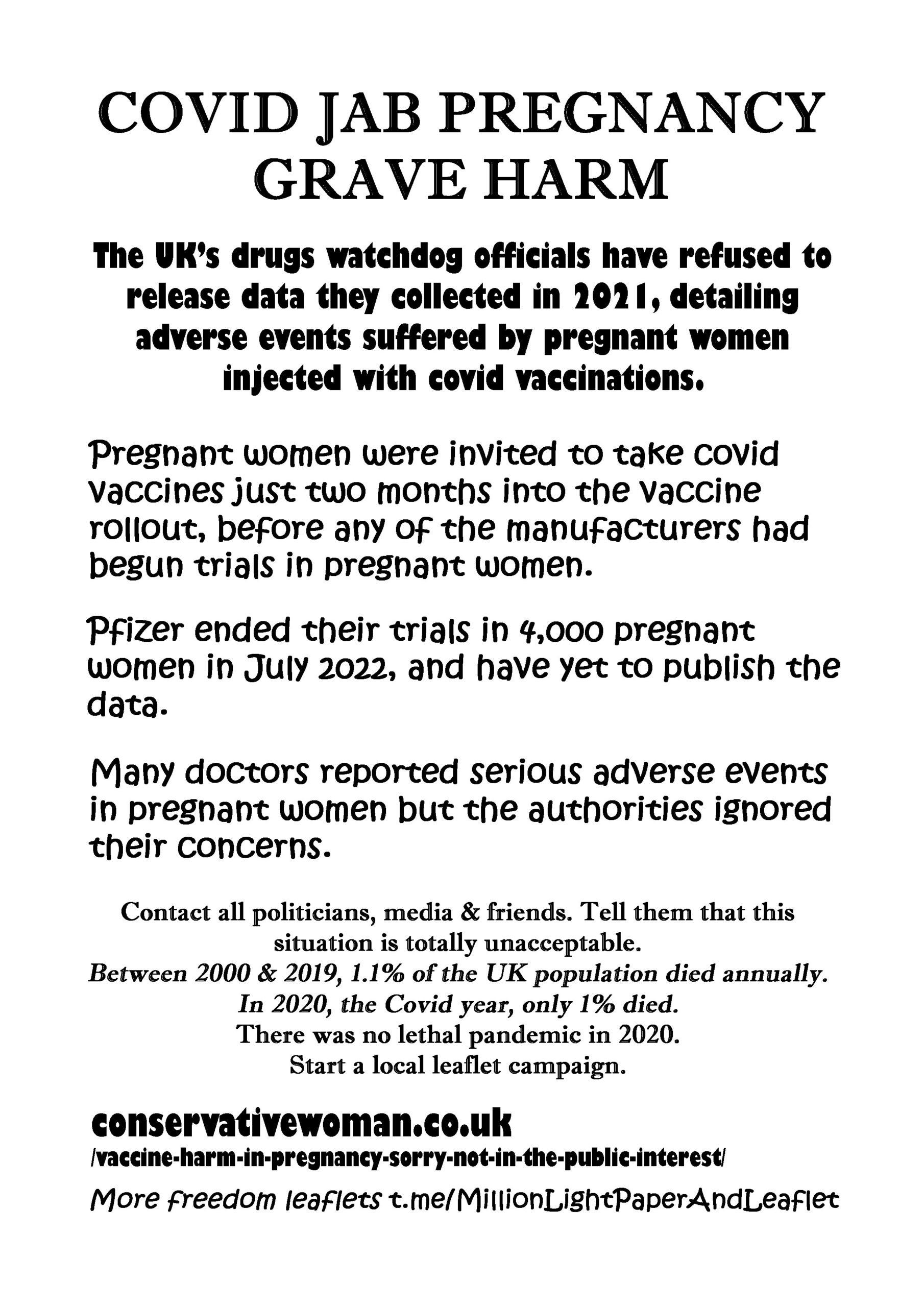 Covid Jab Pregnancy Grave Harm – latest leaflet to print at home, deliver to neighbours, forward to your bad MP & friends online. Start a local leaflet campaign. Deliver 100 leaflets a week (5200 a year). Over 300 leaflet ideas on the link on the leaflet.