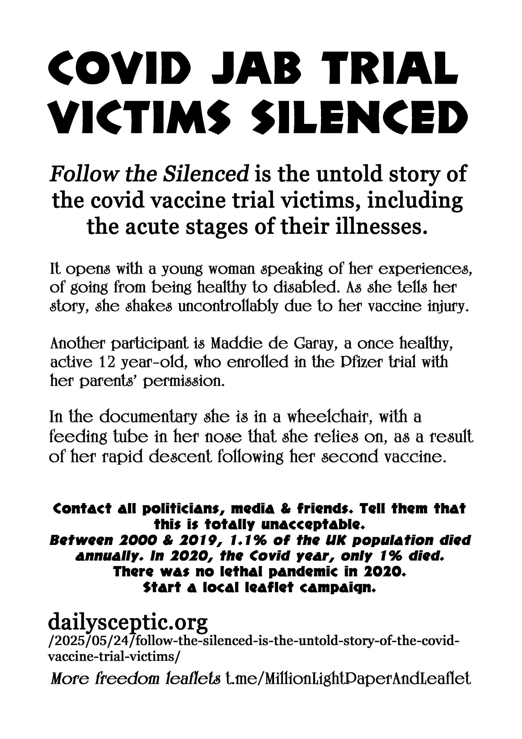 Covid Jab Trial Victims Silenced – latest leaflet to print at home, deliver to neighbours, forward to your bad MP & friends online. Start a local leaflet campaign. Deliver 100 leaflets a week (5200 a year). Over 300 leaflet ideas on the link on the leaflet.