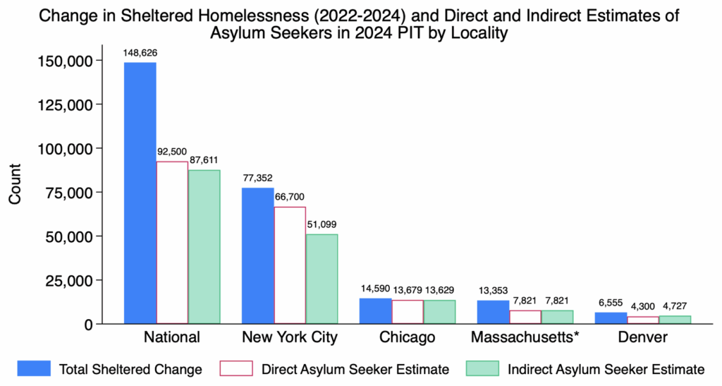 To estimate how much of the rise is due to the influx of asylum seekers, Meyer and colleagues obtained data from government reports and local officials in the four cities mentioned above. (They also used an indirect method, based on the assumption that the Hispanic share of the sheltered homeless population would have remained constant in the absence of the influx.)