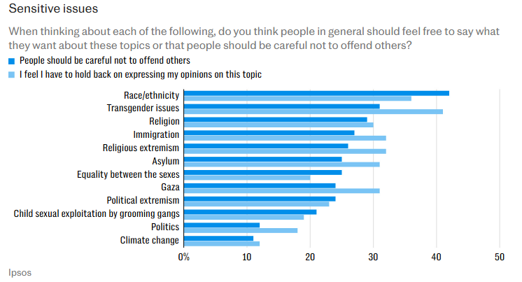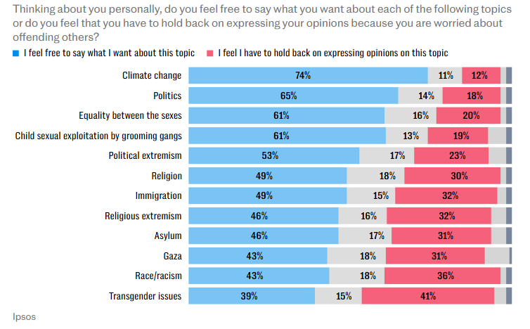 More than a third (36%) felt they had to hold back on expressing their views on race or ethnicity, while 32% said they did not feel they could freely speak out on immigration or religious extremism. On asylum and Gaza, 31% felt constrained, rising to 41% for transgender issues.