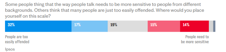 “Nearly half of those polled (49%) believe people are too easily offended, particularly if they speak out on race and immigration issues, according to research for the Commission for Countering Extremism, which advises the Government.”
