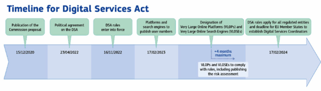 This obligation kicked in, more precisely, for all designated platforms, whether code signatories or not, in mid-2023, four months after their designation by the European Commission (as can be seen in Commission ‘DSA Timeline’ below).