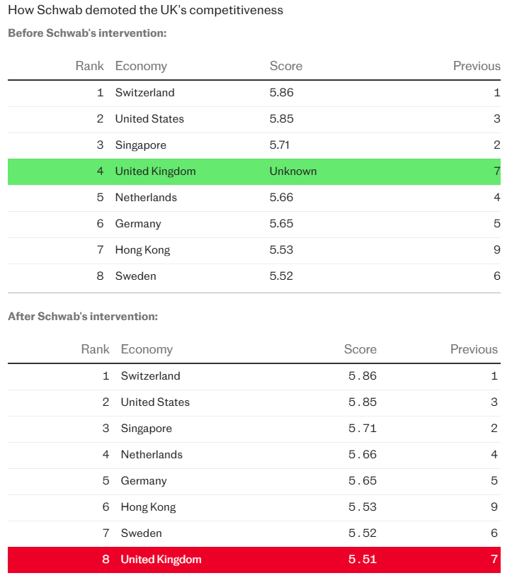Klaus Schwab, the face of the Davos conference in Switzerland for years, allegedly intervened in the WEF’s annual Global Competitiveness Report, which ranks countries on productivity and long-term prosperity.