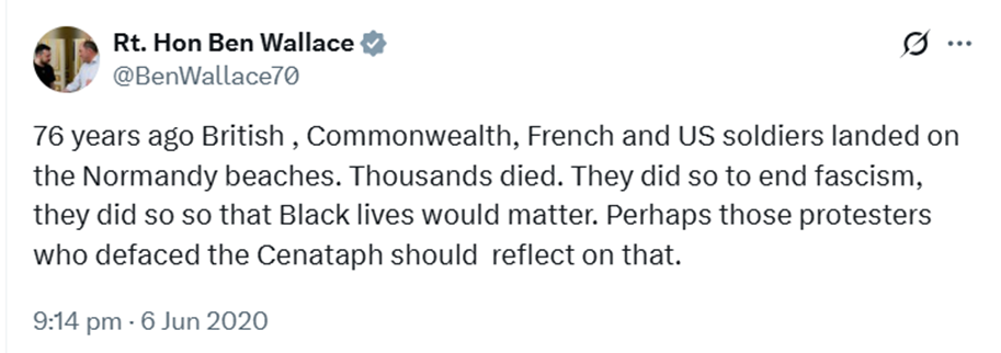 What’s going on in Epping right now? Apparently, it is a very late campaign of the never-ending Second World War, a conflict our leaders sometimes appear to know next to nothing about. On the annual anniversary of D-Day in 2020, Ben Wallace, then the country’s Defence Secretary, responded to news some race-Marxists had defaced the Cenotaph with BLM graffiti by tweeting the following total nonsense: