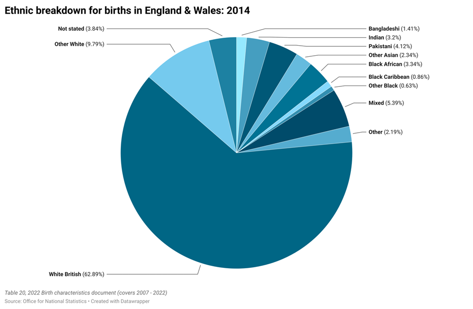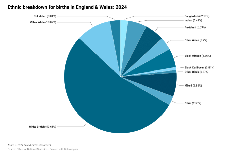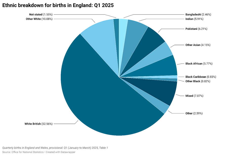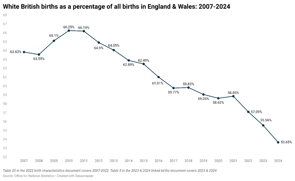 If you look at provisional data for births in England for the first quarter of 2025, which cover January 1st-March 31st, the situation is even worse, with just 52.56% of births in England being white British.