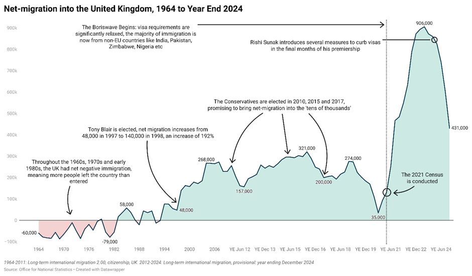 In 2019, the Conservative Party won an 80-seat majority on a pledge to âGet Brexit Doneâ and bring overall numbers down. After we left the EU, the UK regained full control over immigration policy. Yet in 2020-2021, Boris Johnson and home secretary Priti Patel decided to significantly loosen visa rules, including language and income requirements, resulting in a massive surge in immigration to levels never before seen. This betrayal is now commonly derided as the ‘Boriswave‘.