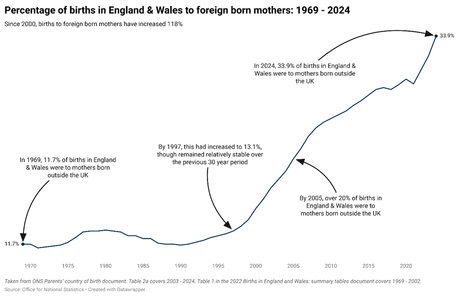 The level of immigration weâve experienced since 1997, under both Labour and Conservative governments, has meant that in 2024, just shy of 34% of births in England and Wales were to a foreign-born mother. This is an astonishing rate of demographic churn. The figure stood at 15.5% at the turn of the millennium, while just 11.7% of births were to foreign-born mothers in 1969, when data were first collected.