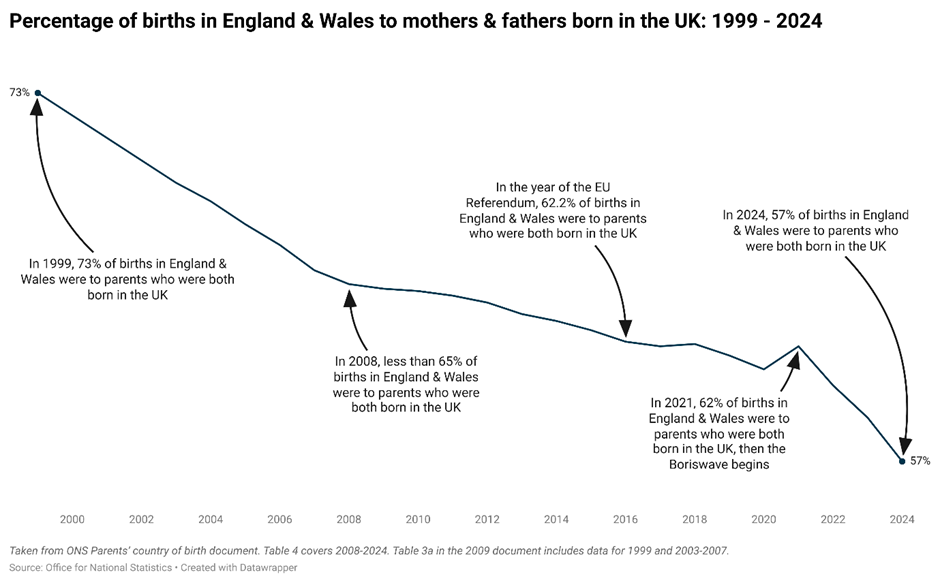 Births to babies with UK-born mothers and fathers hit a record low in 2024, comprising just 57% of births, down from 73% of births in 1999 and down from 62% of births in 2021. A five percentage point drop in just three years is truly incredible, demonstrating the effect of the Boriswave.