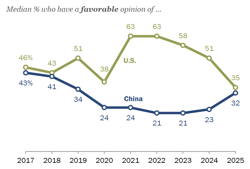 The second is the Spring Global Attitudes Survey, carried out by Pew Research. Based on data from 24 countries of varying income levels, it found the very same thing: the US has been getting less popular since 2023, while China has been getting more popular. Among ten high-income countries that are all US allies, China is now perceived about as favourably as the US. (It must therefore be perceived much more favourably in the world as a whole.)