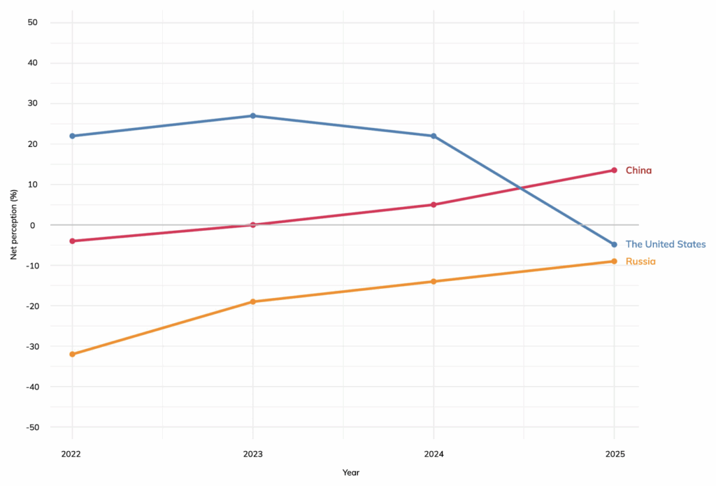 The first is the annual Democracy Perception Index, carried out for the Alliance of Democracies, a pro-Western thinktank. Based on data for 111,273 people from 100 countries, it found that perceptions of the US have been getting less favourable since 2023, while perceptions of China have been getting more favourable. As of 2025, the US is one of the world’s least popular countries, just ahead of Russia.