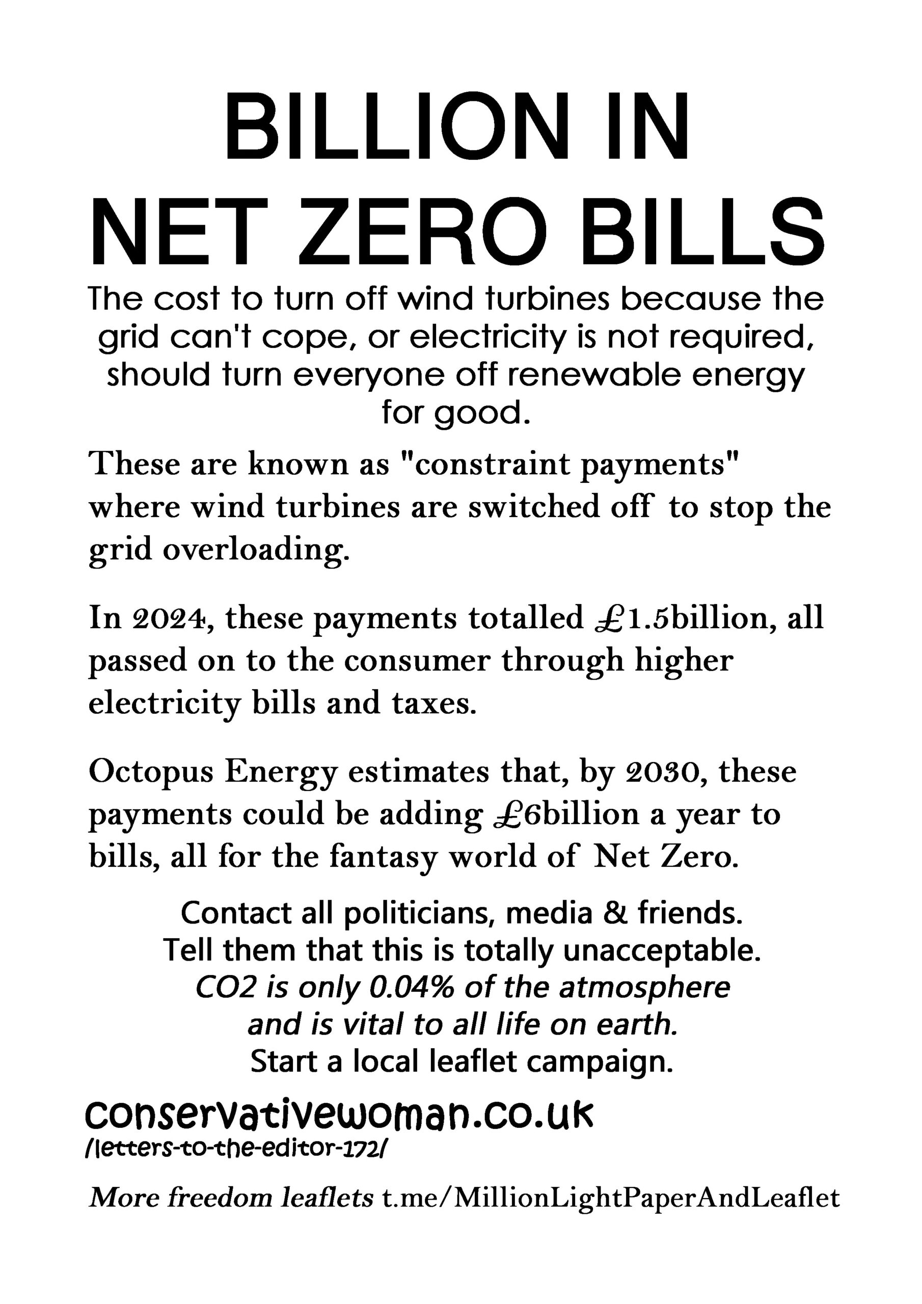 Billions In Net Zero Bills – – latest leaflet to print at home, deliver to neighbours, forward to your bad MP & friends online. Start a local leaflet campaign. Deliver 100 leaflets a week (5200 a year). Over 300 leaflet ideas on the link on the leaflet.