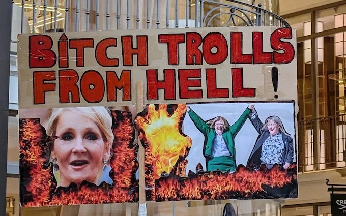 Another sign read: “B—- trolls from hell,” with pictures of J.K. Rowling and the bosses of For Women Scotland, who won the Supreme Court case against the Scottish Government on gender in April.