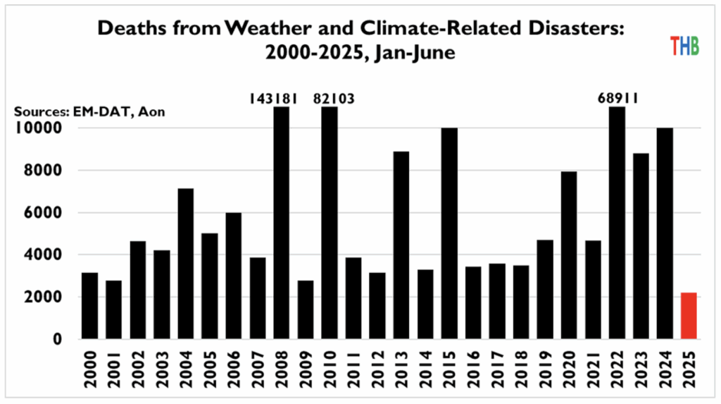 Roger Pielke Jnr has compiled the weather and climate related deaths over the last 25 years and his graph above shows that just 2,200 deaths from a world population of over 8 billion can be attributed to the weather in the first six months of the year. Past number spikes are invariably caused by one-off disasters such as the 138,00 fatalities attributed to Cyclone Nargis in the Indian Ocean during 2008. Pielke concludes that it is likely that the first half of 2025 has seen the fewest deaths related to extreme weather of any half year “in recorded history”.