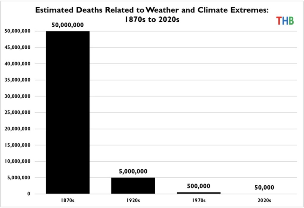 The cyclone news is natural variation of course, but don’t let on to climate fanatics. The news on deaths from extreme weather is not. It is a long-term trend that has seen weather fatalities plunge by over 99% during the last 100 years. As hydrocarbon use pulls billions out of grinding poverty, so fortunate humans can use the extra wealth to protect themselves against all that Nature throws at life on Earth.