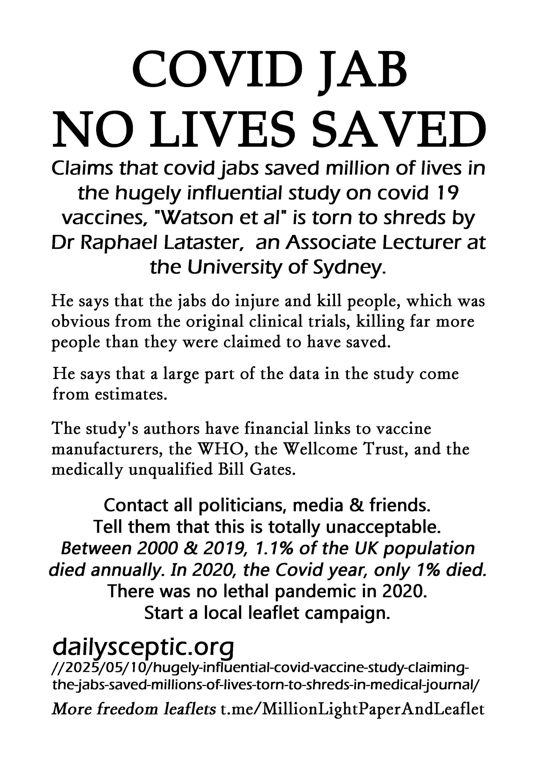 Covid Jab No Lives Saved – latest leaflet to print at home, deliver to neighbours, forward to your bad MP & friends online. Start a local leaflet campaign. Deliver 100 leaflets a week (5200 a year). Over 300 leaflet ideas on the link on the leaflet.