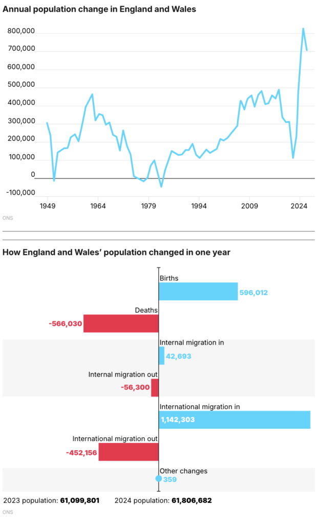 There were an estimated 61.8 million people in England and Wales in mid-2024, up 706,881 from 61.1 million in mid-2023, according to the Office for National Statistics (ONS).
