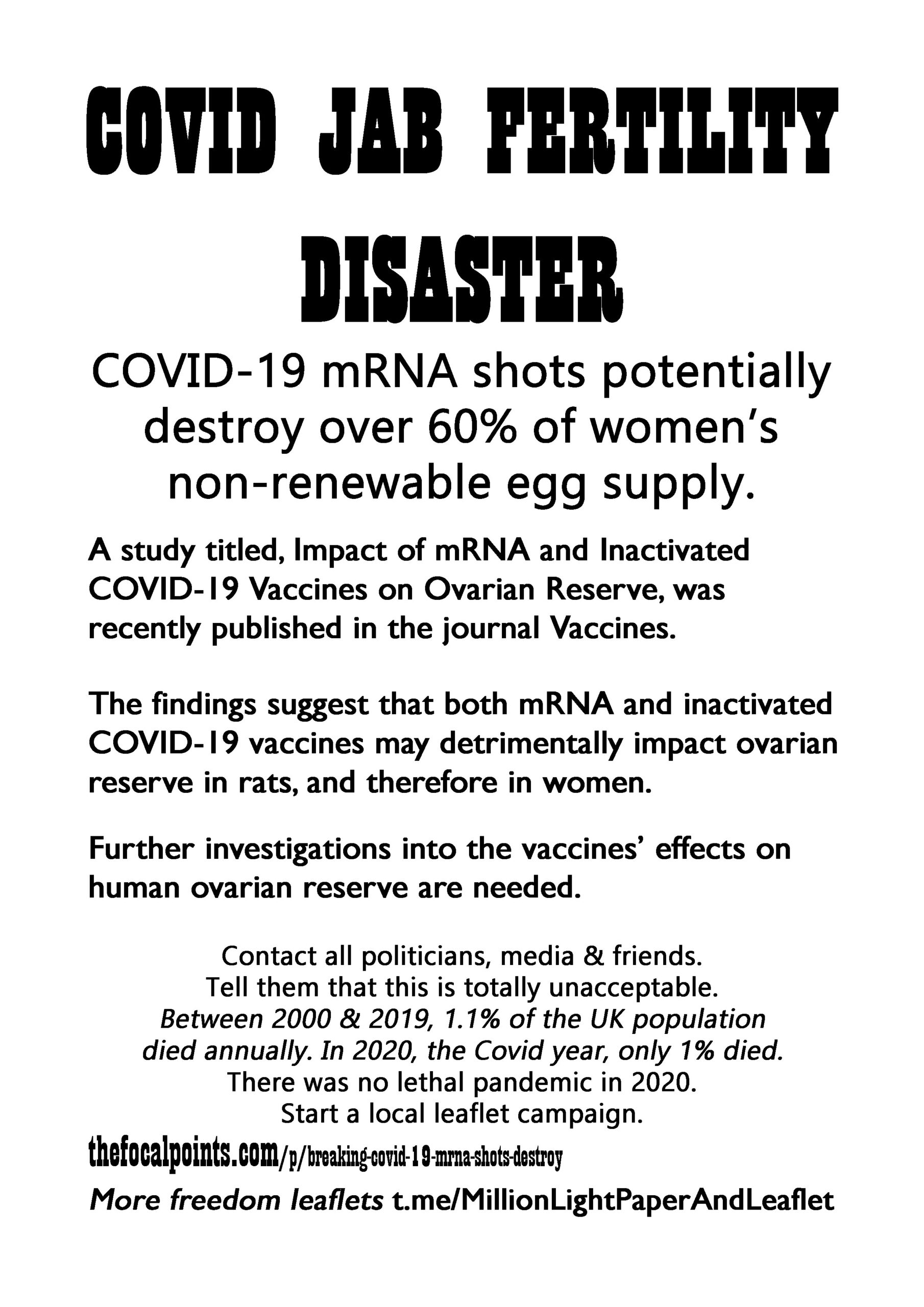 Covid Jab Fertility Disaster – latest leaflet to print at home, deliver to neighbours, forward to your bad MP & friends online. Start a local leaflet campaign. Deliver 100 leaflets a week (5200 a year). Over 300 leaflet ideas on the link on the leaflet.