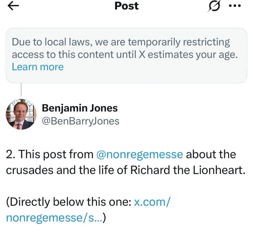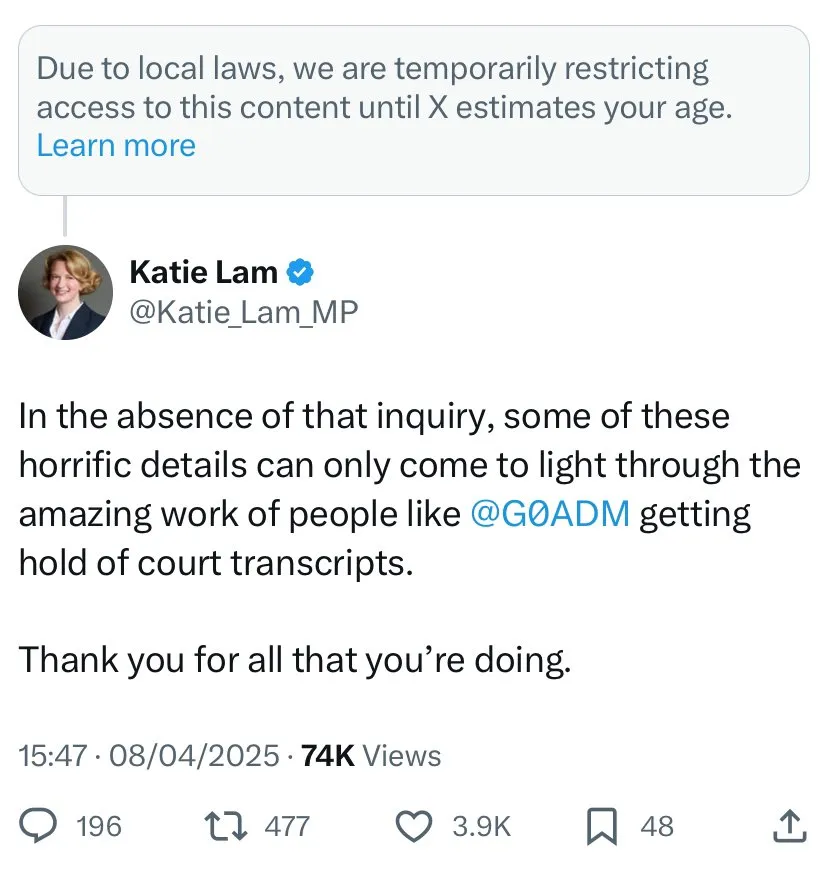And so now in the UK, social media users are experiencing a curated version of the internet. Many examples have already been posted online. A thread on X by Benjamin Jones of the Free Speech Union includes a number of screenshots of posts that have been quietly ‘disappeared’. For instance, a post about the grooming gangs scandal by Conservative MP Katie Lam has been replaced with a message explaining that the content has been restricted: