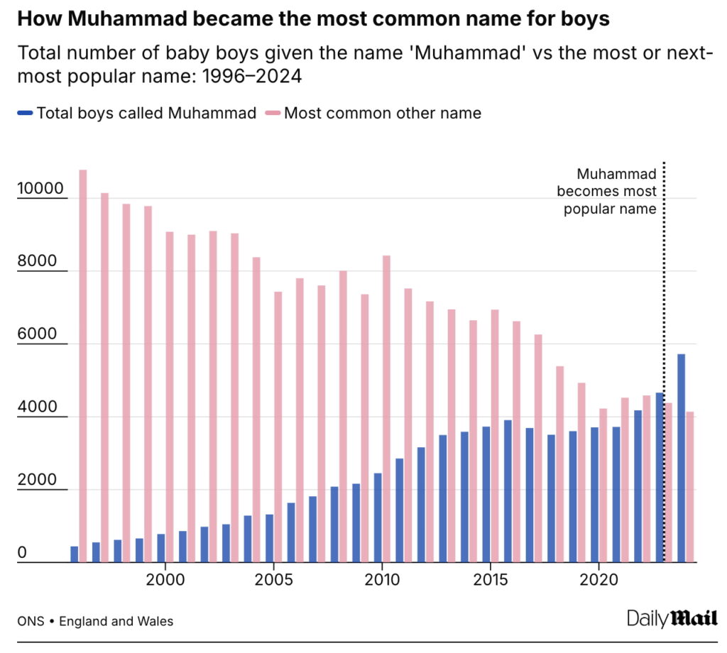 Muhammad is once again the most popular baby name for boys in England and Wales. The Mailhas the details: