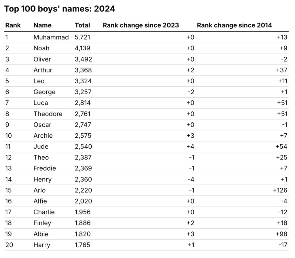 Noah came in second, with Oliver in third, just as they did in 2023. Four Keirs were born in 2023, but none last year after Sir Keir Starmer became Prime Minister.