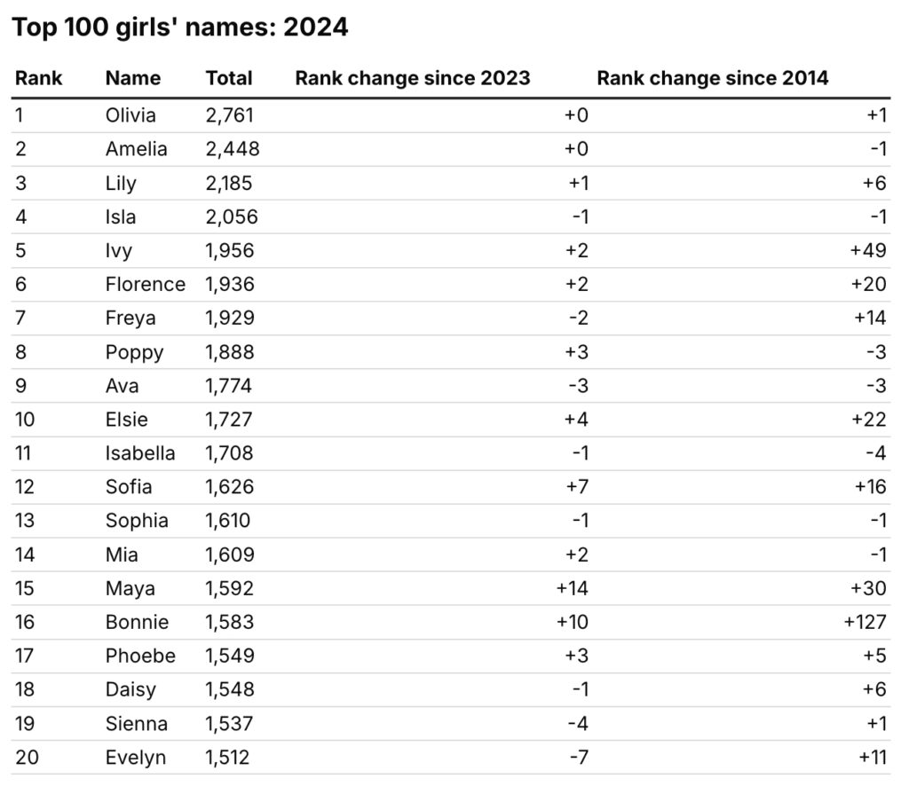 Olivia has been in the top three for girls’ names every year since 2006, with 2,761 girls given the name in 2024.