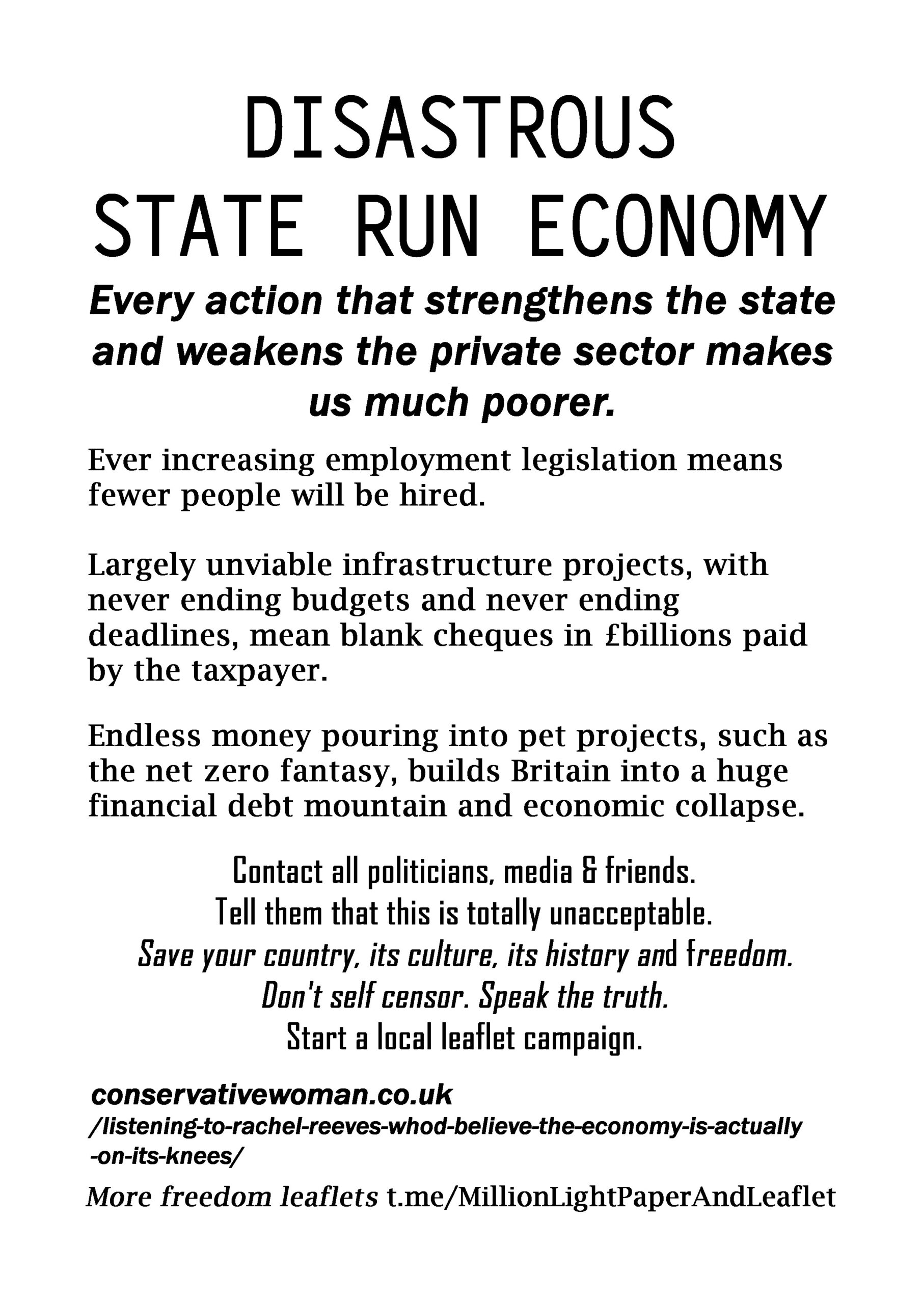 Disastrous State Run Economy – latest leaflet to print at home, deliver to neighbours, forward to your bad MP & friends online. Start a local leaflet campaign. Deliver 100 leaflets a week (5200 a year). Over 300 leaflet ideas on the link on the leaflet.