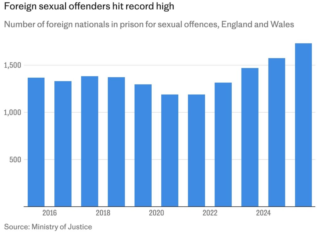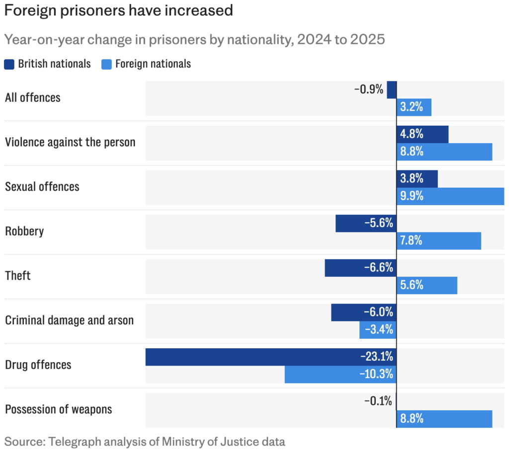 According to stark new Ministry of Justice data, record numbers of foreign sex and violent offenders are now in UK prisons. The Telegraphhas the story.